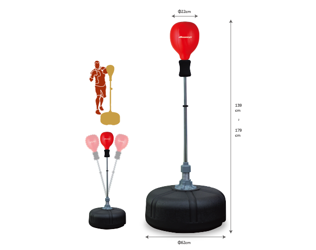 • Adjustable height: 139-179cm • PU punching bag: 22x28.5cm • HDPE base: Φ62x28cm(H), about 4kgs • Base tank with water is about 60kgs • Available color: Red or Black